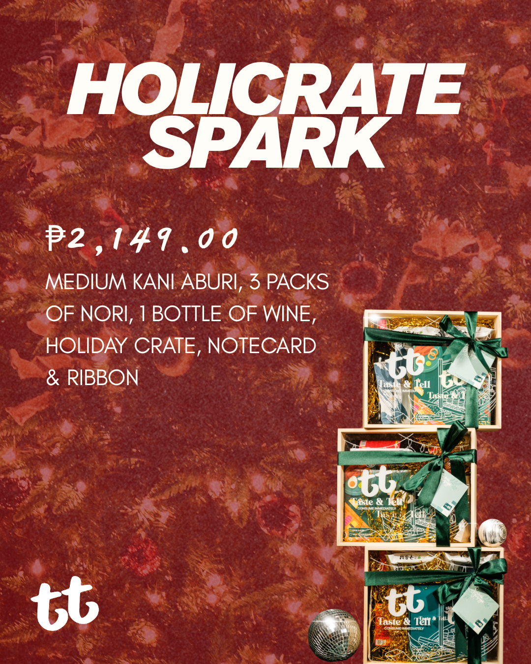 This package includes:1 Holiday Crate 1 Kani Aburi Medium 3 Packs of Nori 1 Bottle of Wine2 Chopsticks 1 Note Card with Ribbon